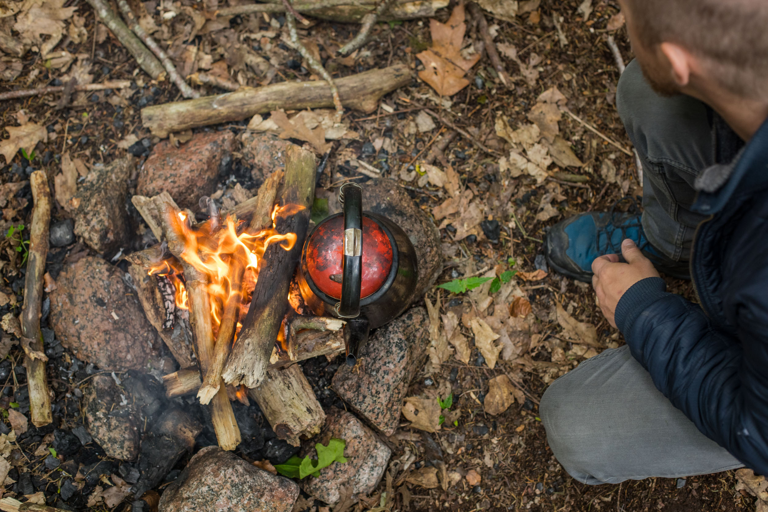 En pædagog i Lille-Gryn laver bål med børnene i skoven ved Svaneke på Bornholm.En pædagog i Lille-Gryn laver bål med børnene i skoven ved Svaneke på Bornholm.