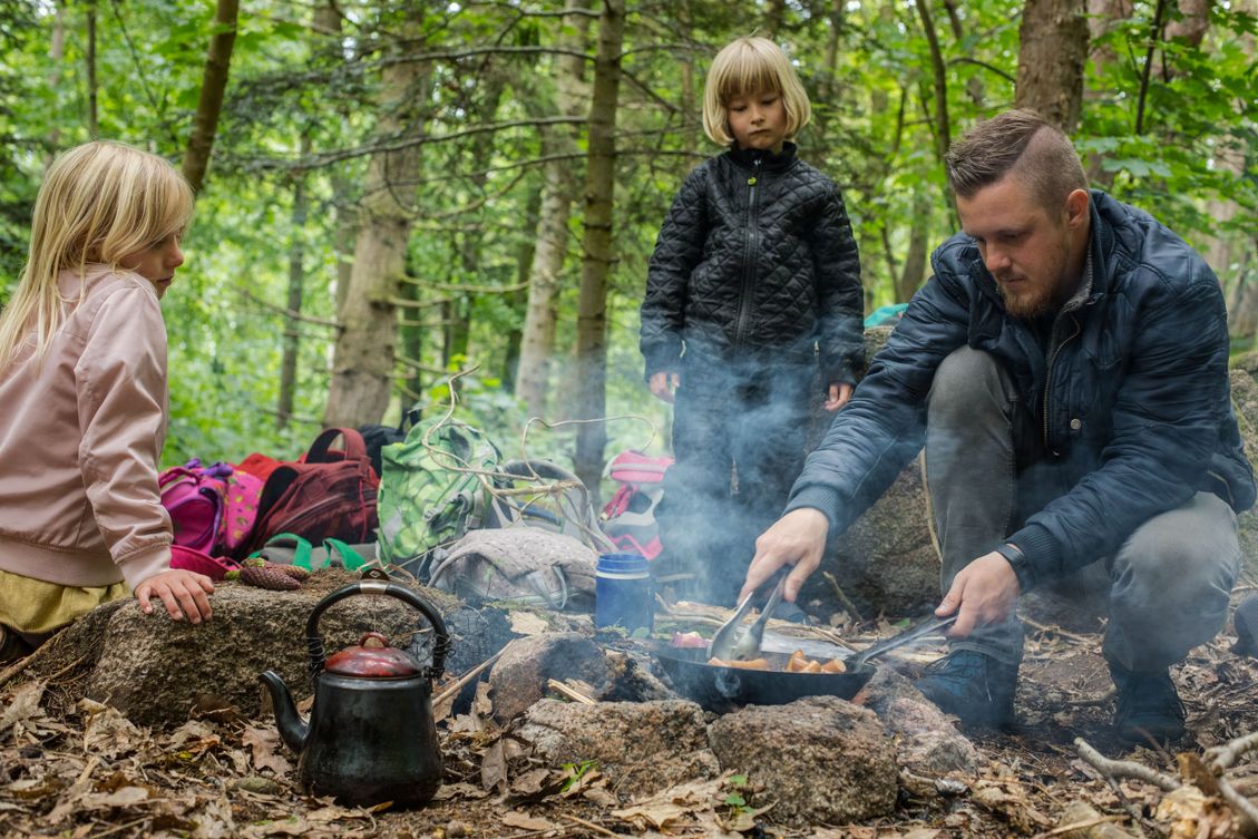 En pædagog i Lille-Gryn laver mad på bål til børnene i skoven ved Svaneke på Bornholm.