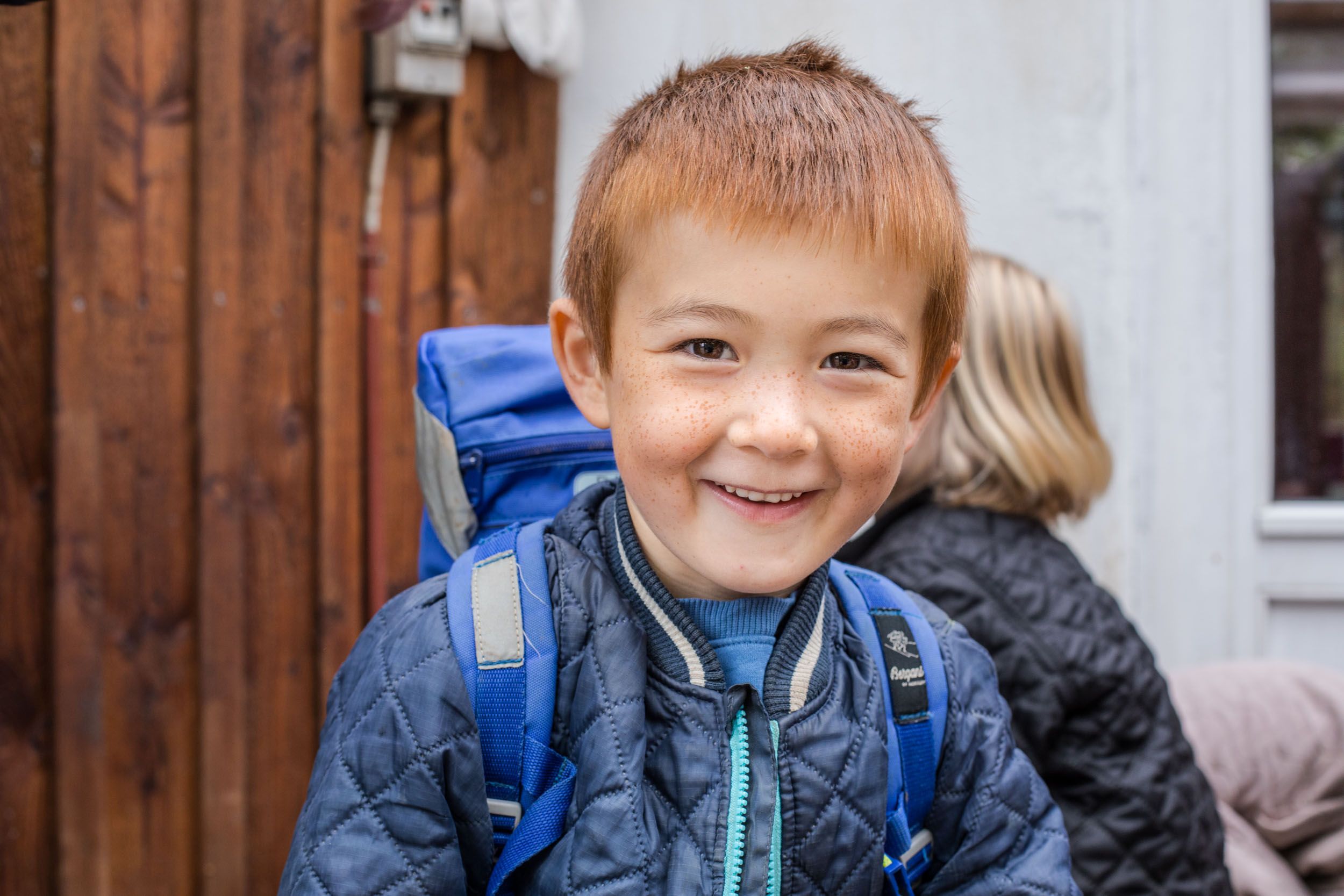 Pædagog med et barn i Lille-Gryn siger farvel til skovgruppen inden deres daglige tur i skoven.