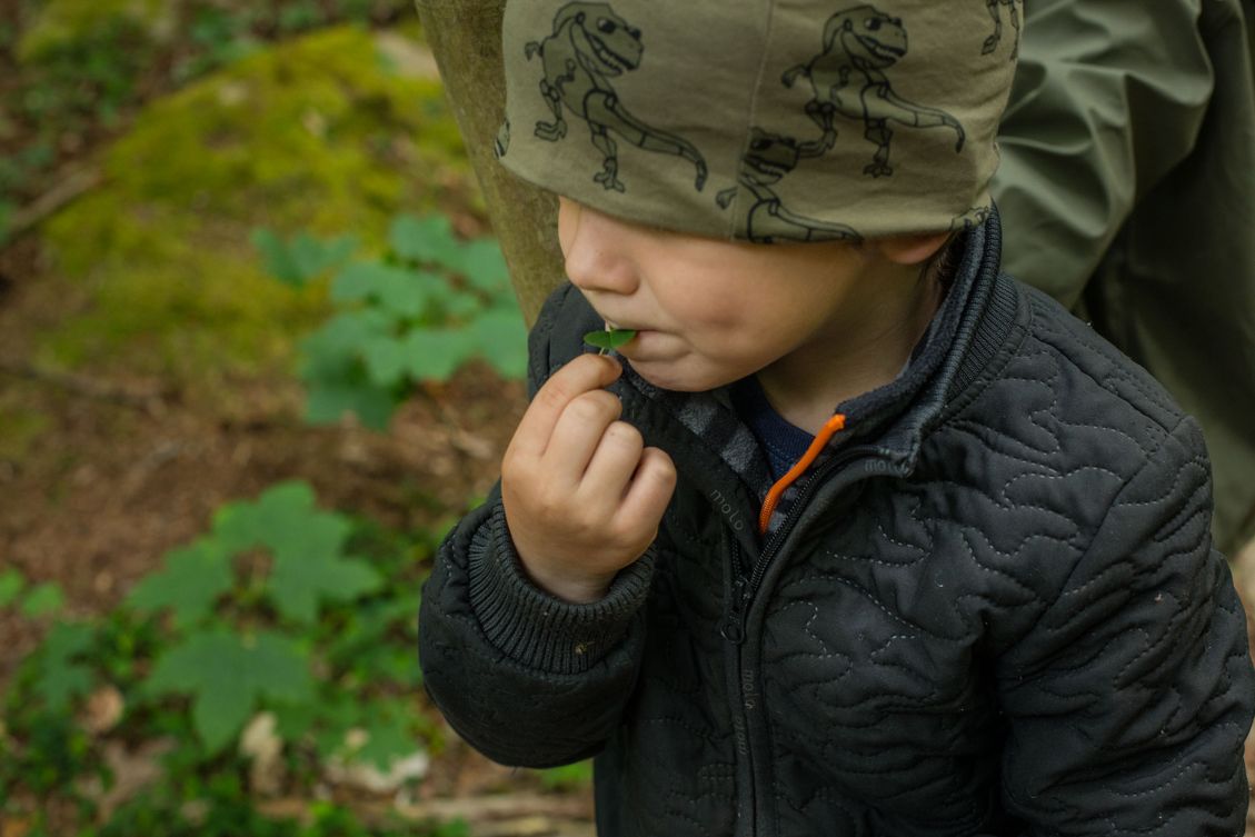 Skovgruppebarn i Lille-Gryn smager på skovsyre i skoven ved Svaneke på Bornholm.