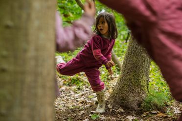 Skovgruppebørn i Lille-Gryn leger i skoven ved Svaneke på Bornholm.